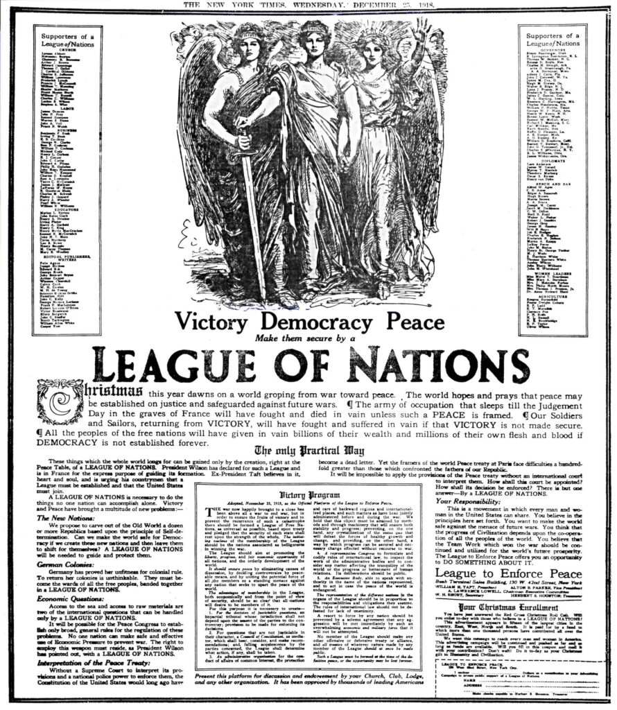 World War I, 1914-1918, was the most devastating and transformative event in modern history. By 1918, European and American scholars, philosophers, diplomats, and politicians had become preoccupied with the question of why the war had broken out, and how to ensure a just foundation for western civilization that would ensure such a conflict never took place again. U.S. President Woodrow Wilson, a scholar and idealist whose so-called Fourteen Points had established, among other things, the principle of national self-determination, was an avid supporter of the concept of a League of Nations, whose existence would ensure that diplomacy rather than war should ensure that open negotiation, rather than secret alliances and military power, prevented another world war. The League of Nations Covenant was established in Article I of the Treaty of Versailles in June 1919.